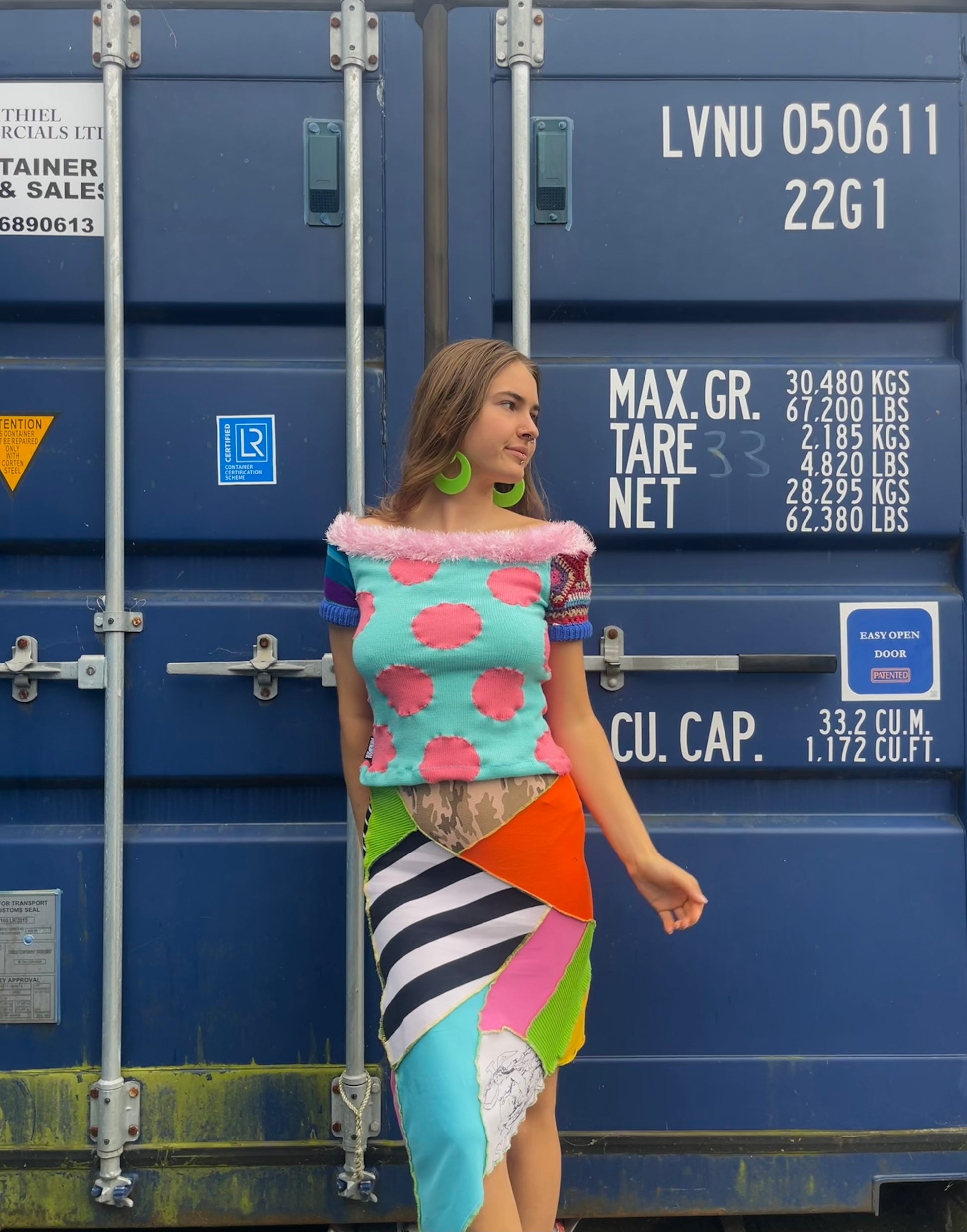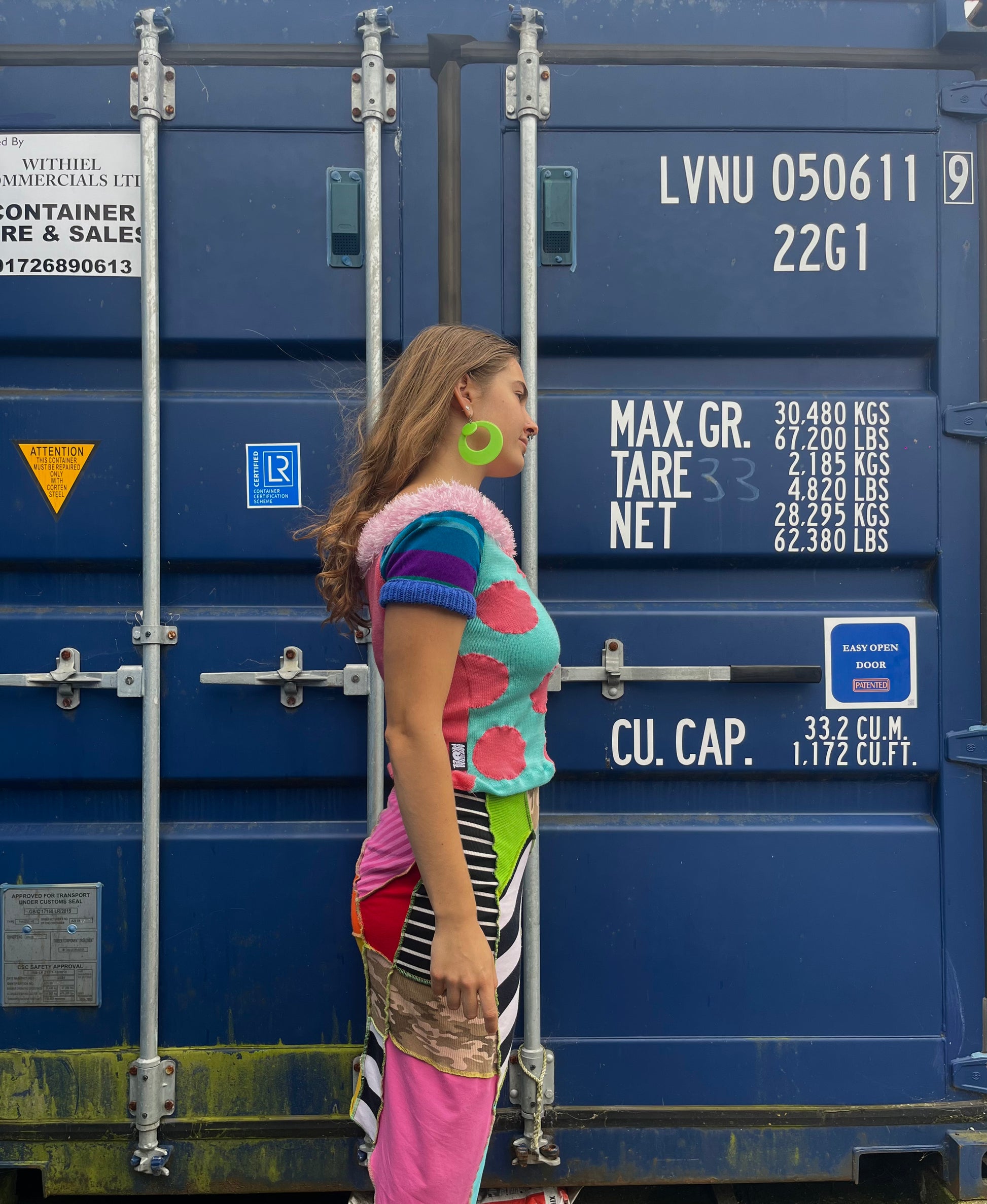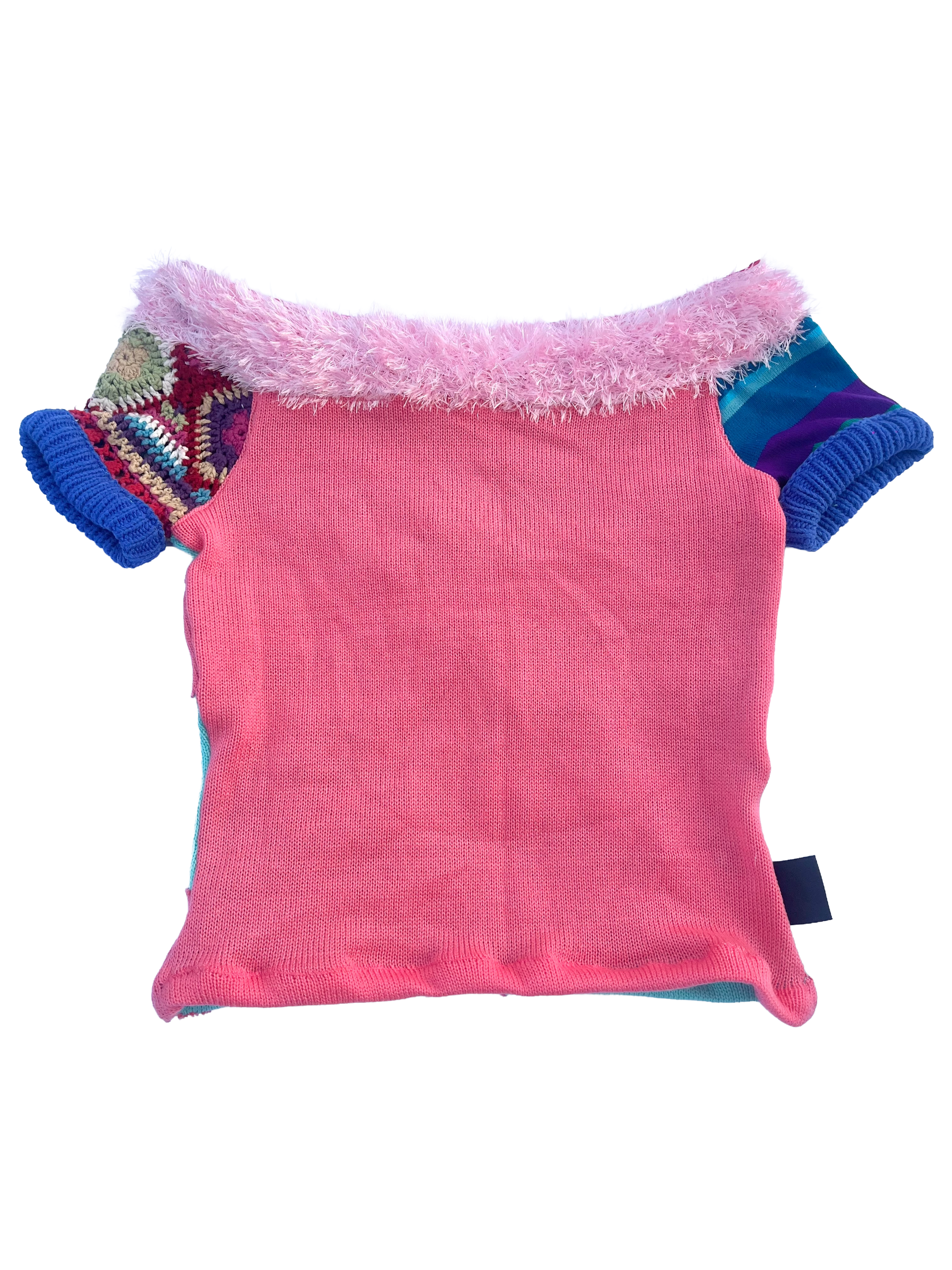This top has a subtle off the shoulder neckline, with a pink fuzzy band. The bodice features bubblegum blue knit with pink polka dots. One sleeve has a stripey blue knit pattern and the other, rainbow crochet- both with an electric blue bias binding.